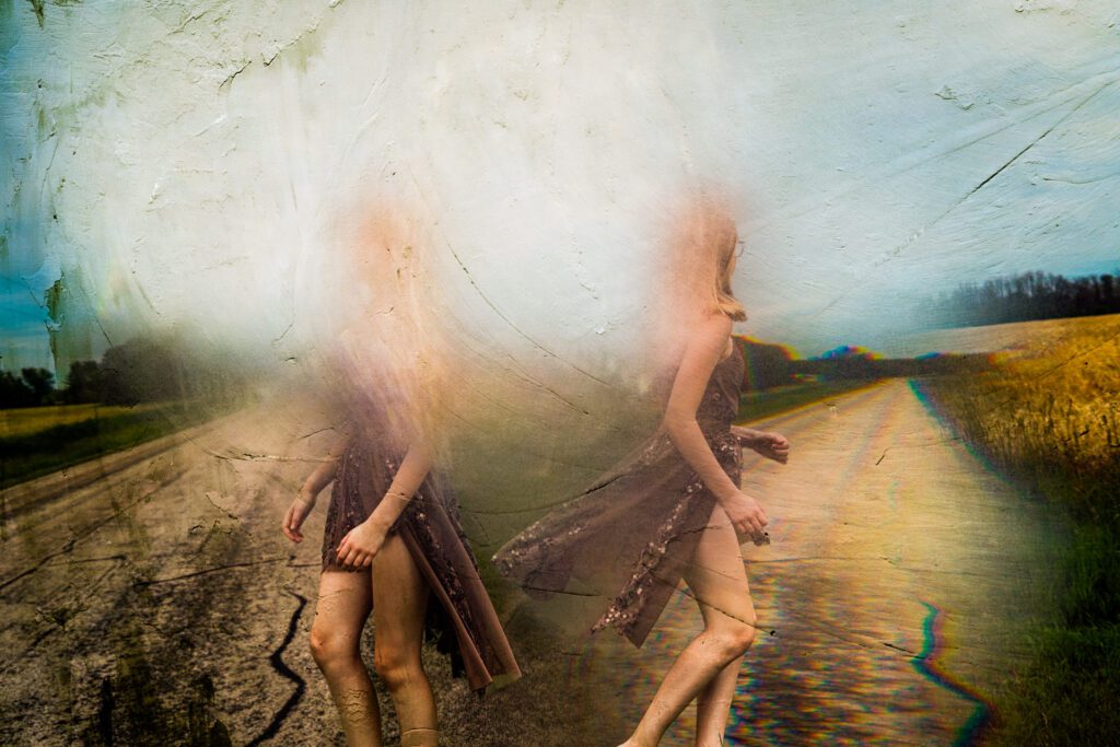 It’s like a mirror dimension. There is one world, and another world almost exactly like it but just a bit different. The girls are crossing paths, leaving one dimension to go into the other. The one on the right is confused, this new world is blurry. The one on the left is relieved to be in a world that is more clear.