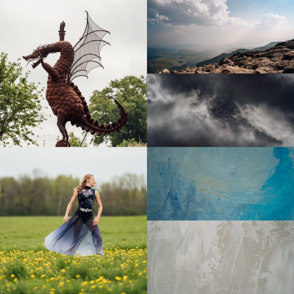 I started with an image of my daughter. I chose this ‘in-between’ moment, because her body posture looks like it is in preparation. She’s getting ready for something big. I first thought of her facing wind or something like that. As I was looking through my images, I came across this dragon. This statue was created by a local artist, Clyde Wynia, and his work can be found throughout Marshfield. Local treasures. This particular image was taken while my daughter and I were driving around taking photos. The background image was a vacation photo from our trip to Colorado. I used a cloud image, one I use often, and two paintings/paint textures.