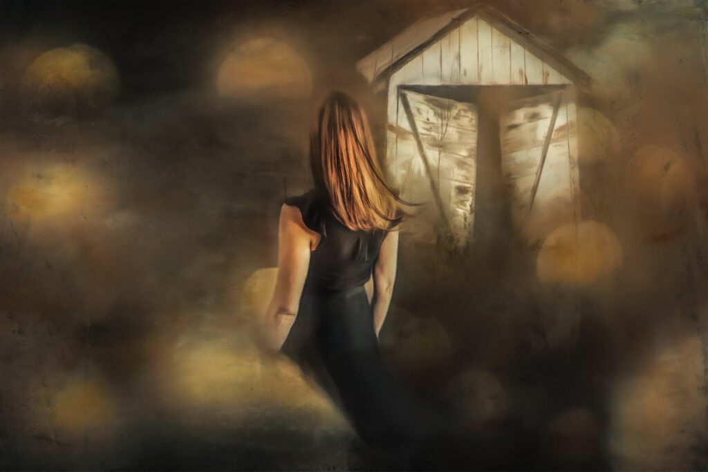 What I was most interested in from these images was the lighting. There was just a little light left coming in my window so I collected a few portraits in lighting I never would have considered before. For the composite, I chose the one that pulled most at me and reused the same background images in different ways. When I look at this one in relation to the first I thought; no longer following someone else’s guidance.